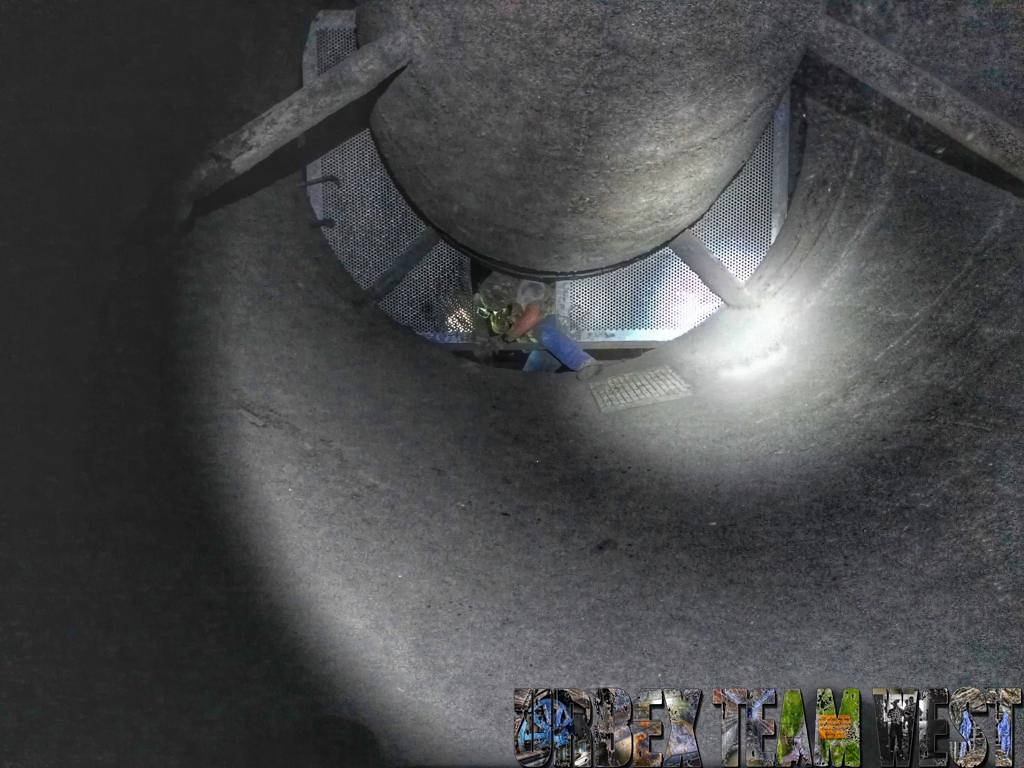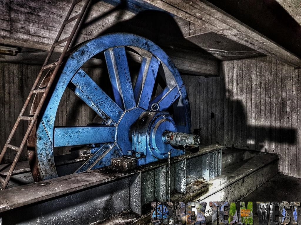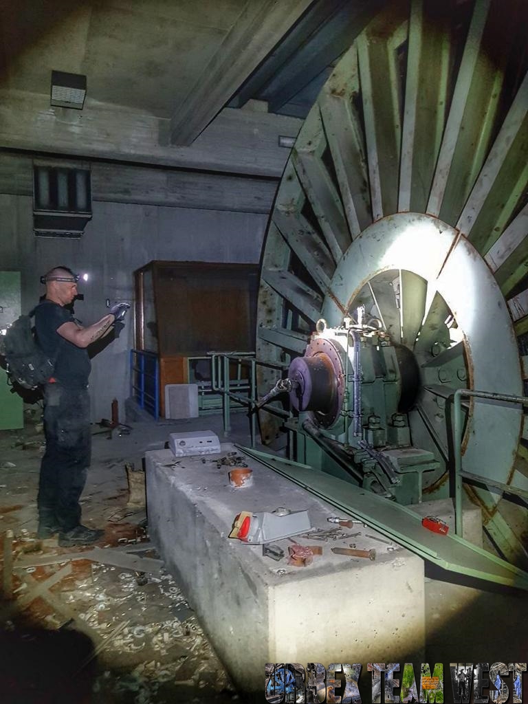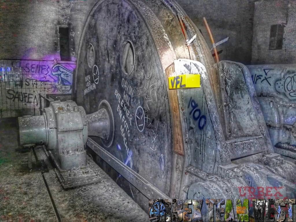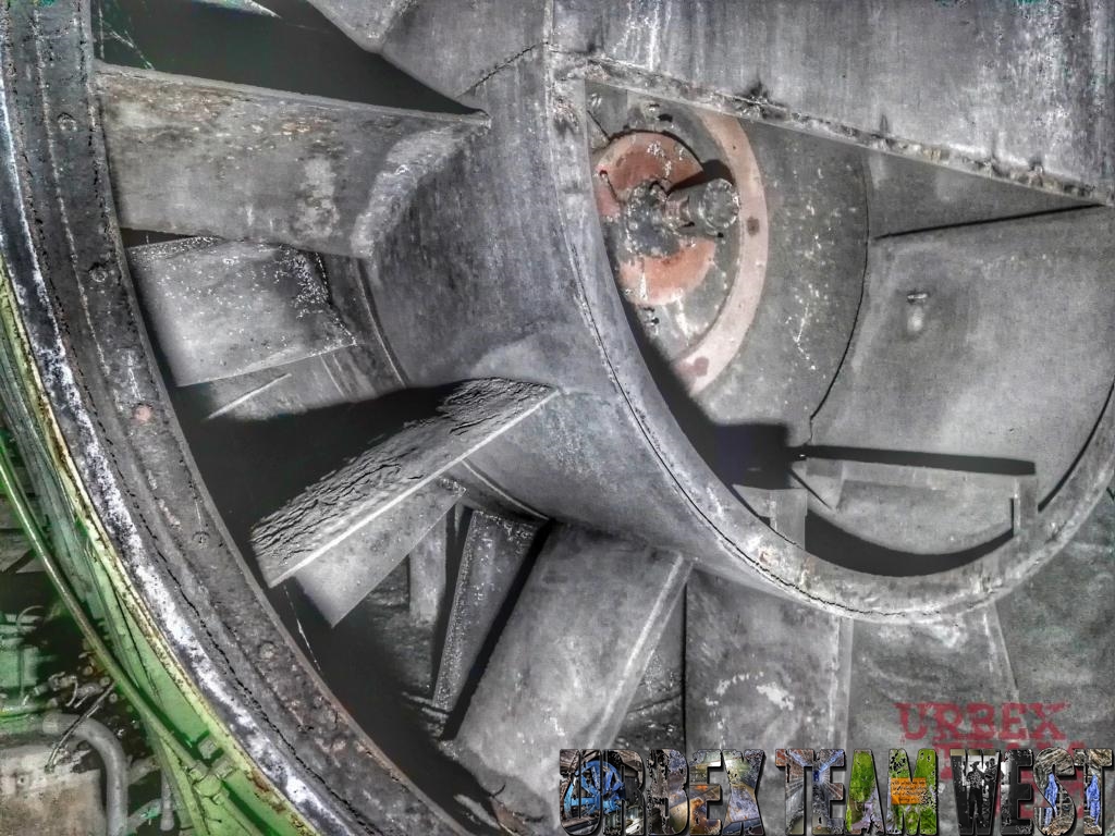 Nachdem wir den Schacht erreicht haben, steigen wir durch eine große Abluftöffnung in die Anlage ein, hier erwarten uns riesige Turbinen und Technik aus der noch aktiven Zeit der Zeche.