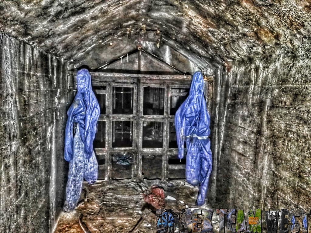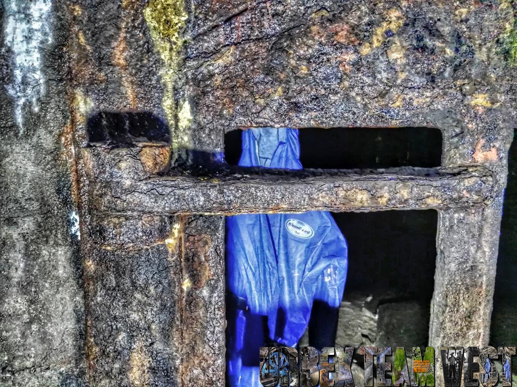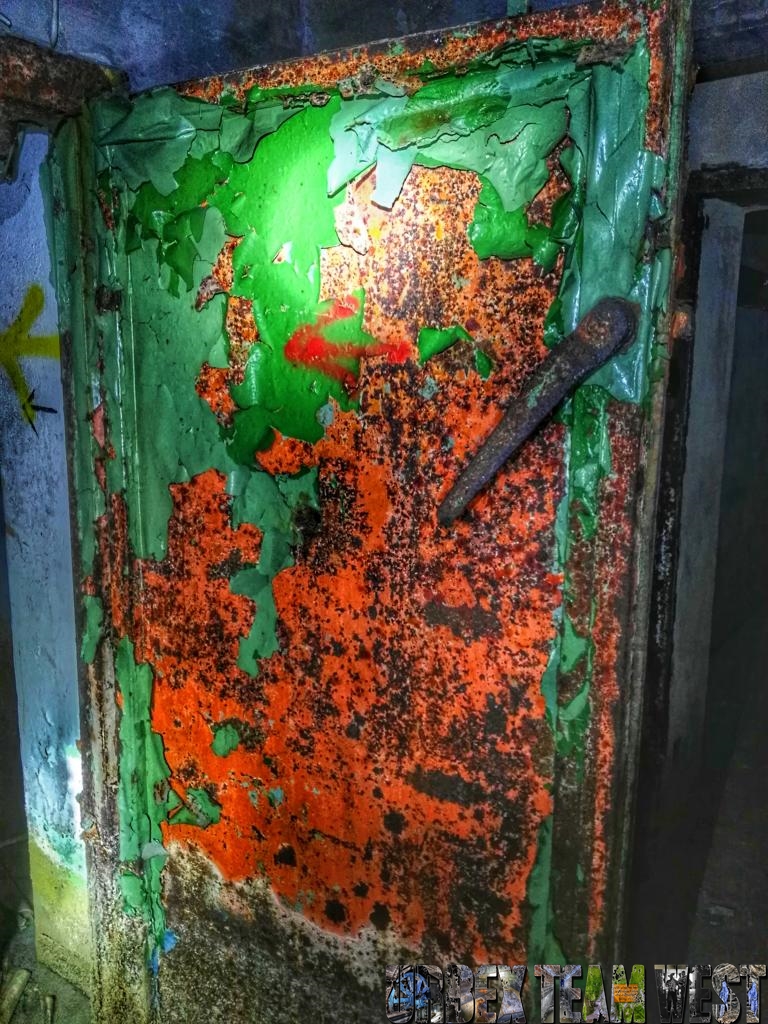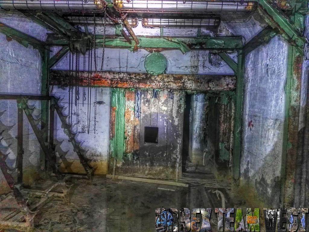 Durch andere Eingänge gelangen wir in ein anderes Gangssytem welches eine Beschussanlage zum Test von Munition beherbergt, auch heute noch sind die Einschusslöcher um die Anlage herum zu erkennen, wir meinen auch ein hier und da ein Projektil im Holz ausmachen zu können. Diese Anlage wurde allerdings, nicht wie häufig behauptet, erst nach dem Krieg gebaut. Wir fanden eine Tür, welche mehrere beweglich gelagerte Stahlplatten beinhaltet, wir nehmen an, dass hier der Überdruck durch die Schusstests abgeleitet wurde.